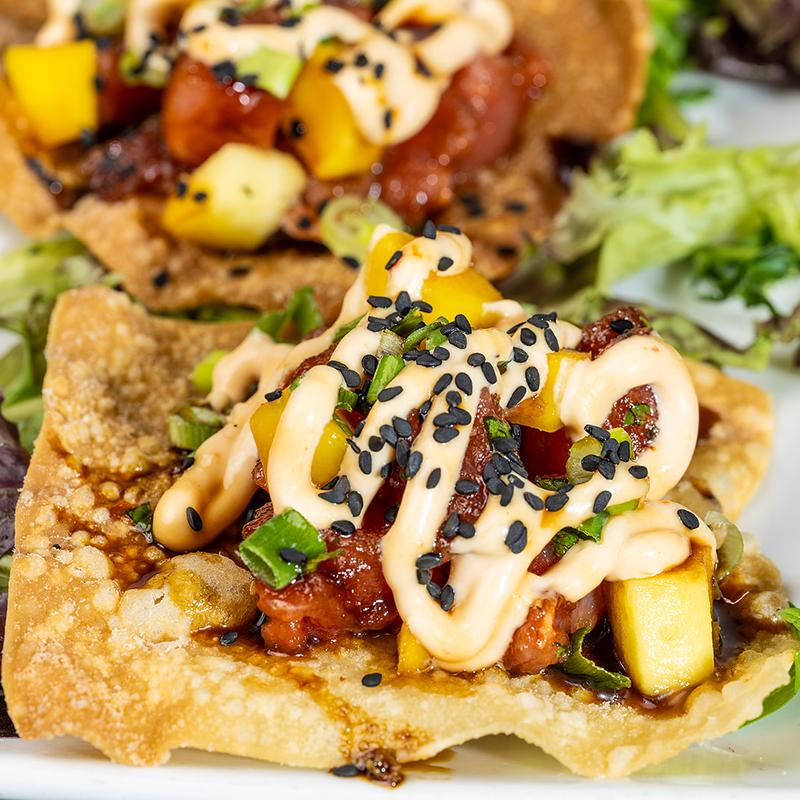 (3) Ahi tuna, mango, avocado, green onion, sesame seeds, sweet soy, spicy mayo, wonton chips.